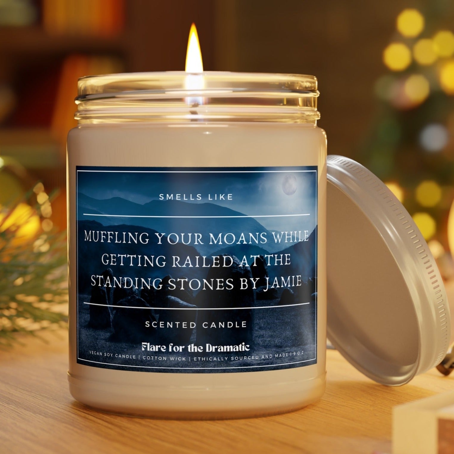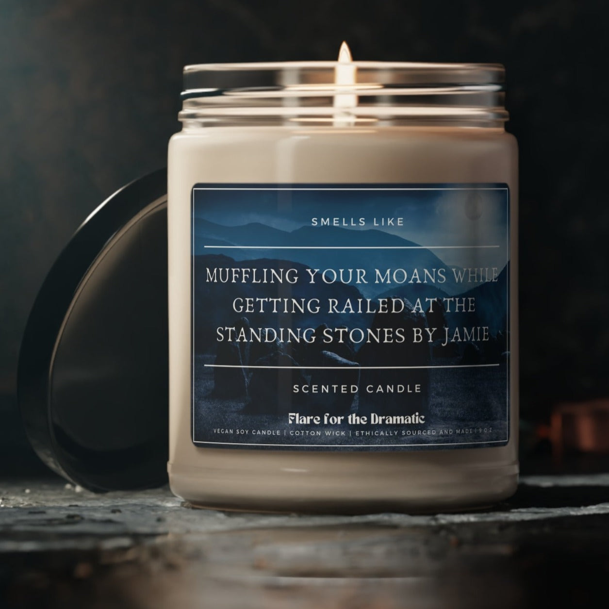Longing to go back in time for a man like Jamie? Us too. This candle features the mysterious standing stones shrouded in moonlight. Smells like "Muffling your Moans while Getting Railed at the Standing Stones by Jamie" and is perfect fan merch for the sexy Scot book, film, fanfic or show stan in your life. Funny gag gift or sexy scent to read / write by? That's your call.