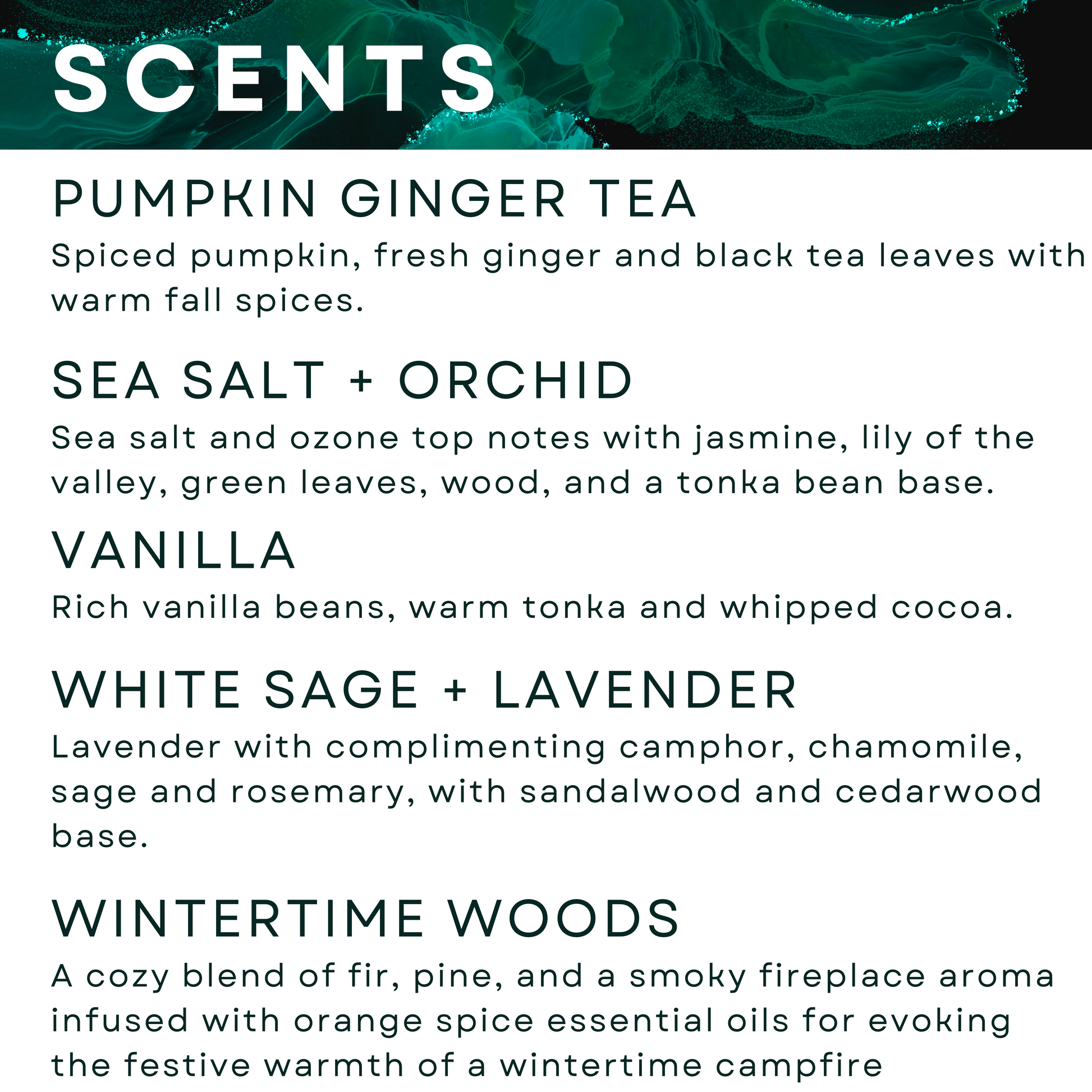 Sea Salt + Orchid - sea salt, ozone on the top with complimenting jasmine, lily of the valley, green leaves and wood, tonka bean base