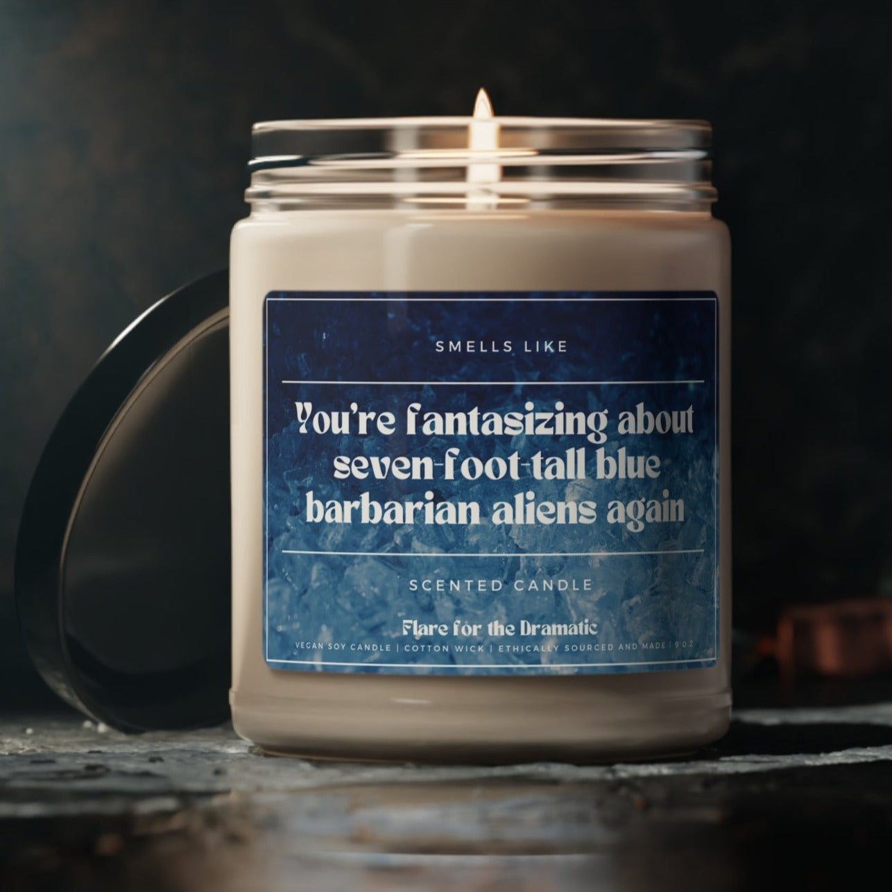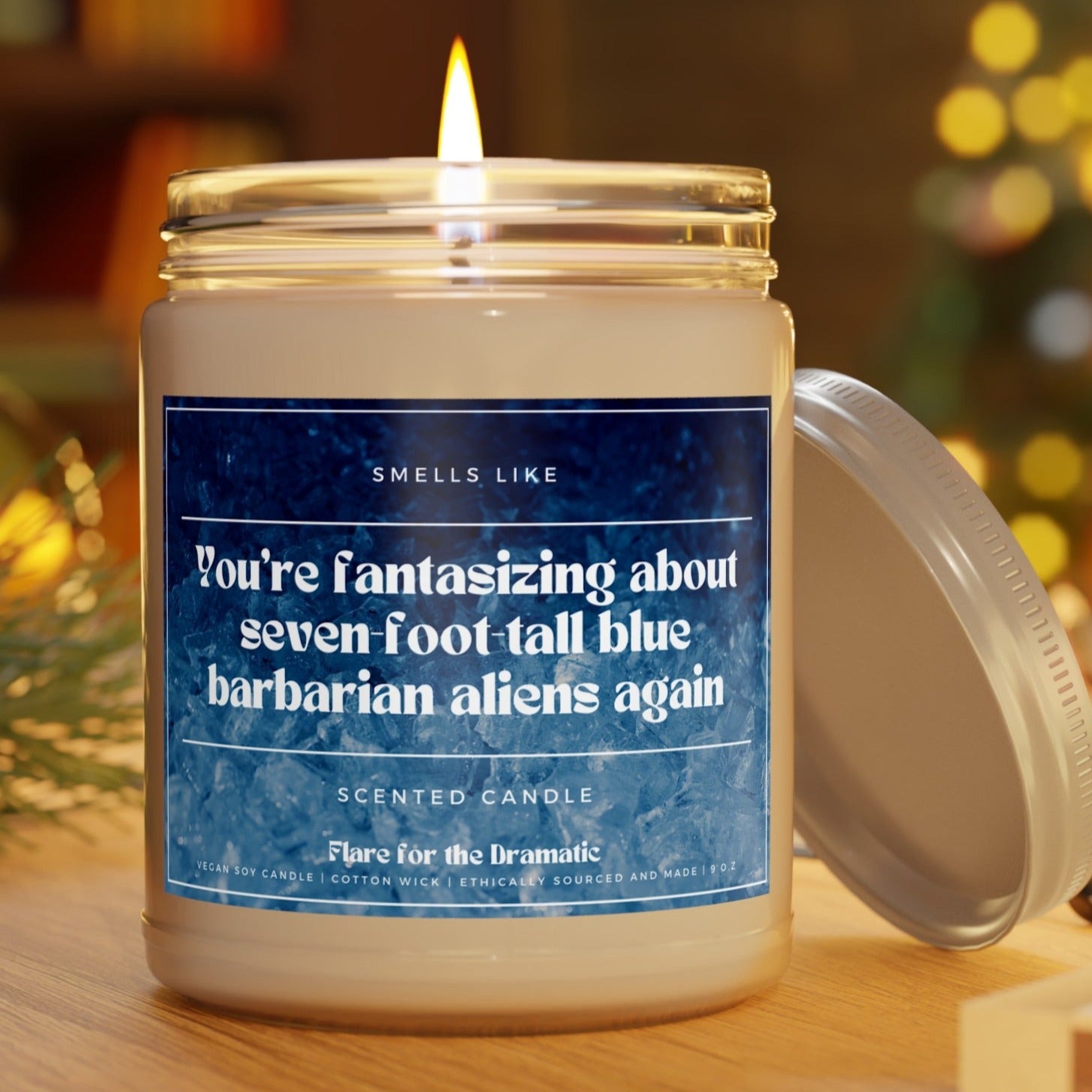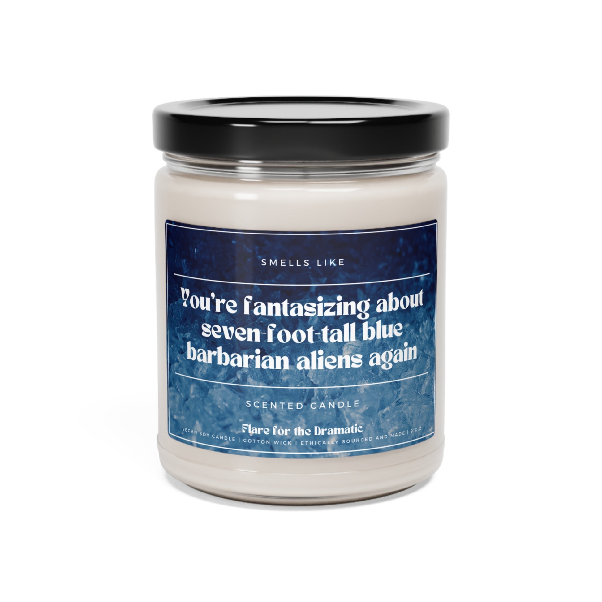 This candle features a dark and moody ice planet inspired design. Smells like "You're fantasizing about seven-foot-tall blue barbarian aliens again" and is perfect monster romance fan merch for the fanfic or show stan in your life. Funny gag gift or sexy scent to read / write fanfiction by? That's your call. Hot blue barbarians from another planet may be alien, but that doesn't mean you can't fantasize about them.